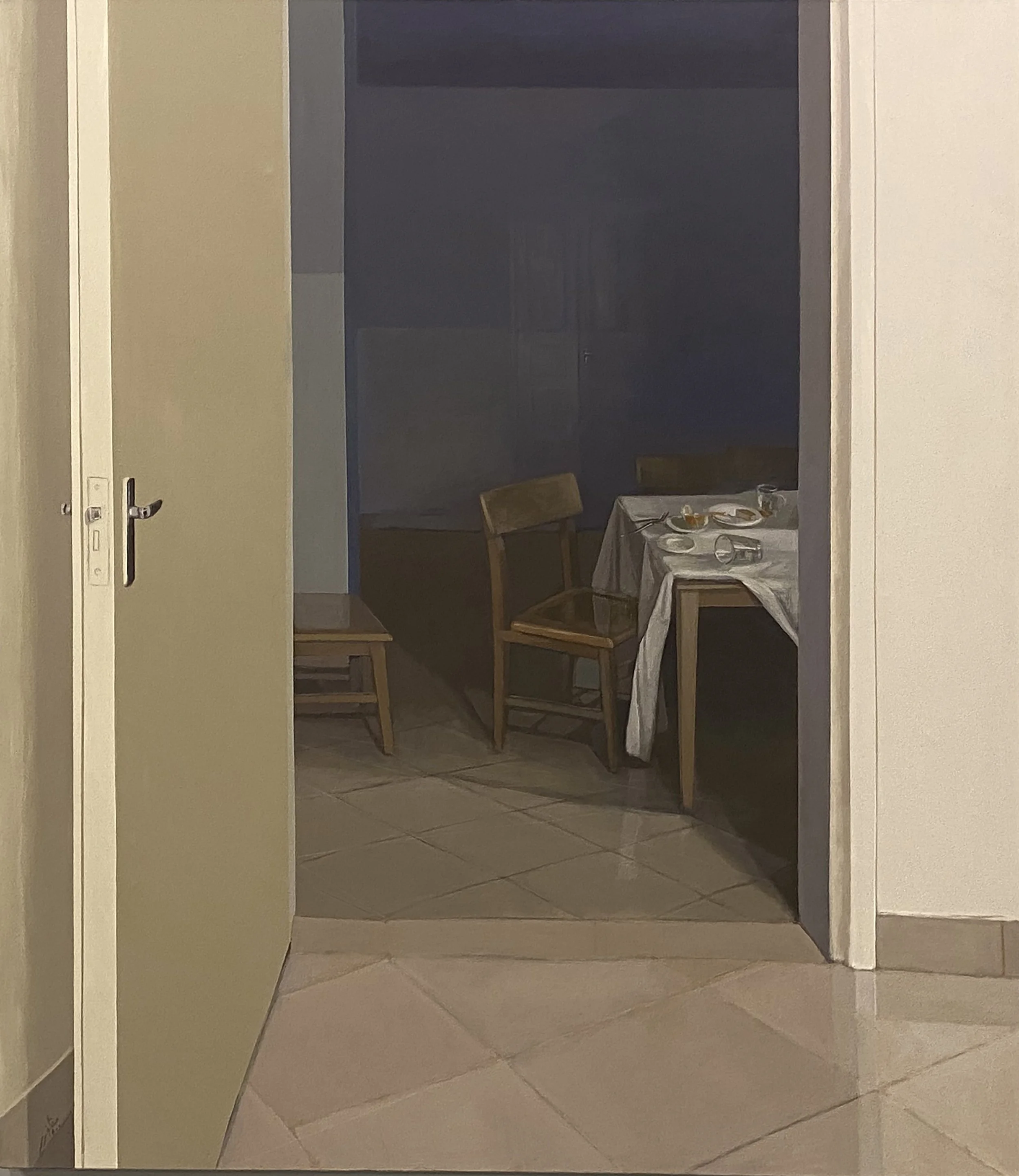 Masoumeh Mozaffari (b. 1958, Tehran) is an Iranian figurative painter and university Lecturer. She has a BFA from the University of Tehran and an MFA from the Islamic Azad University. Her realist paintings portray everyday faces, her portraits often look cold and neutral, charged with understated tension. Objects in her paintings float or fall, and she occasionally adds Cubist influences. Mozaffari uses acrylic, oil, pencil, and pen in her work.