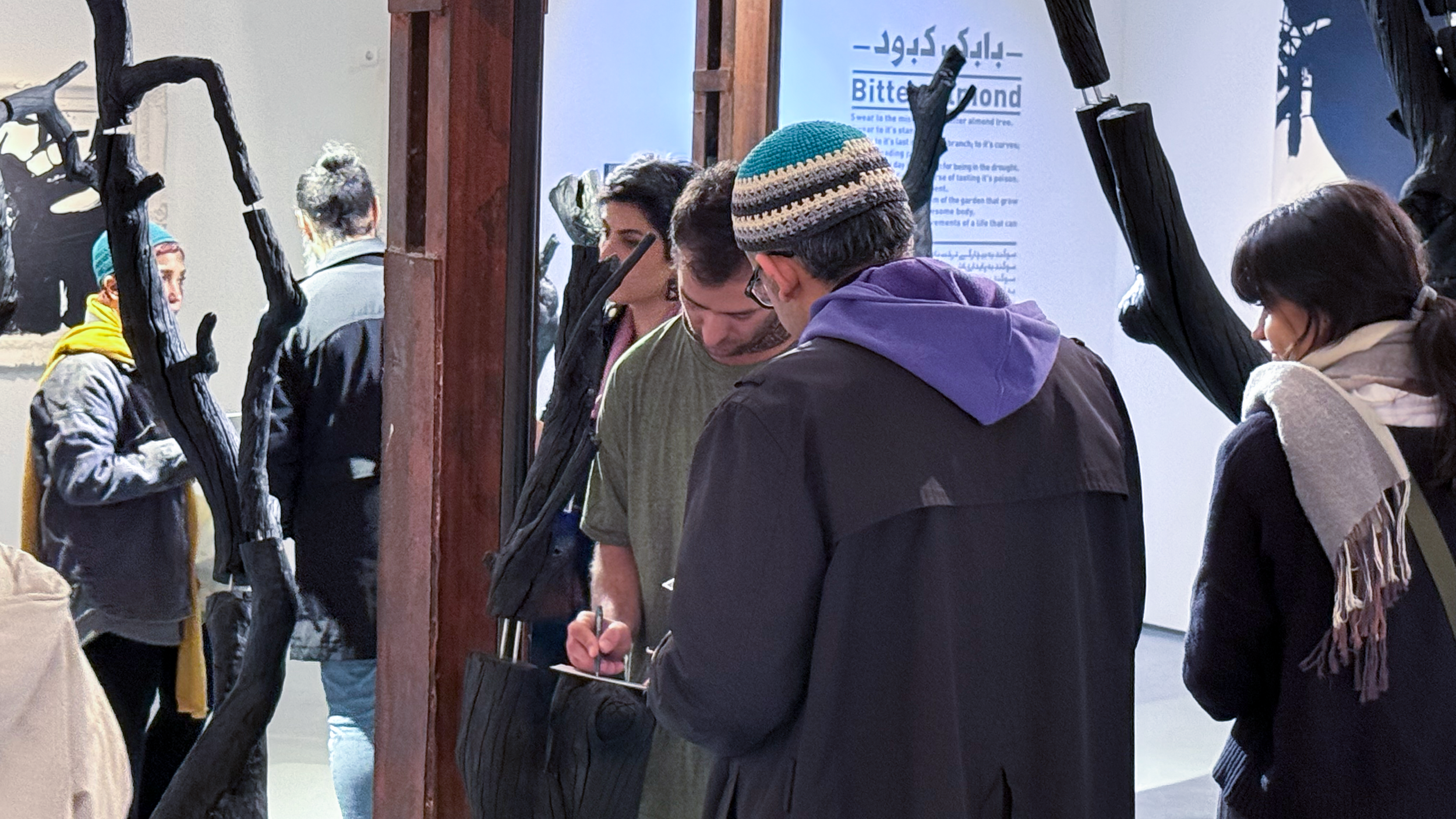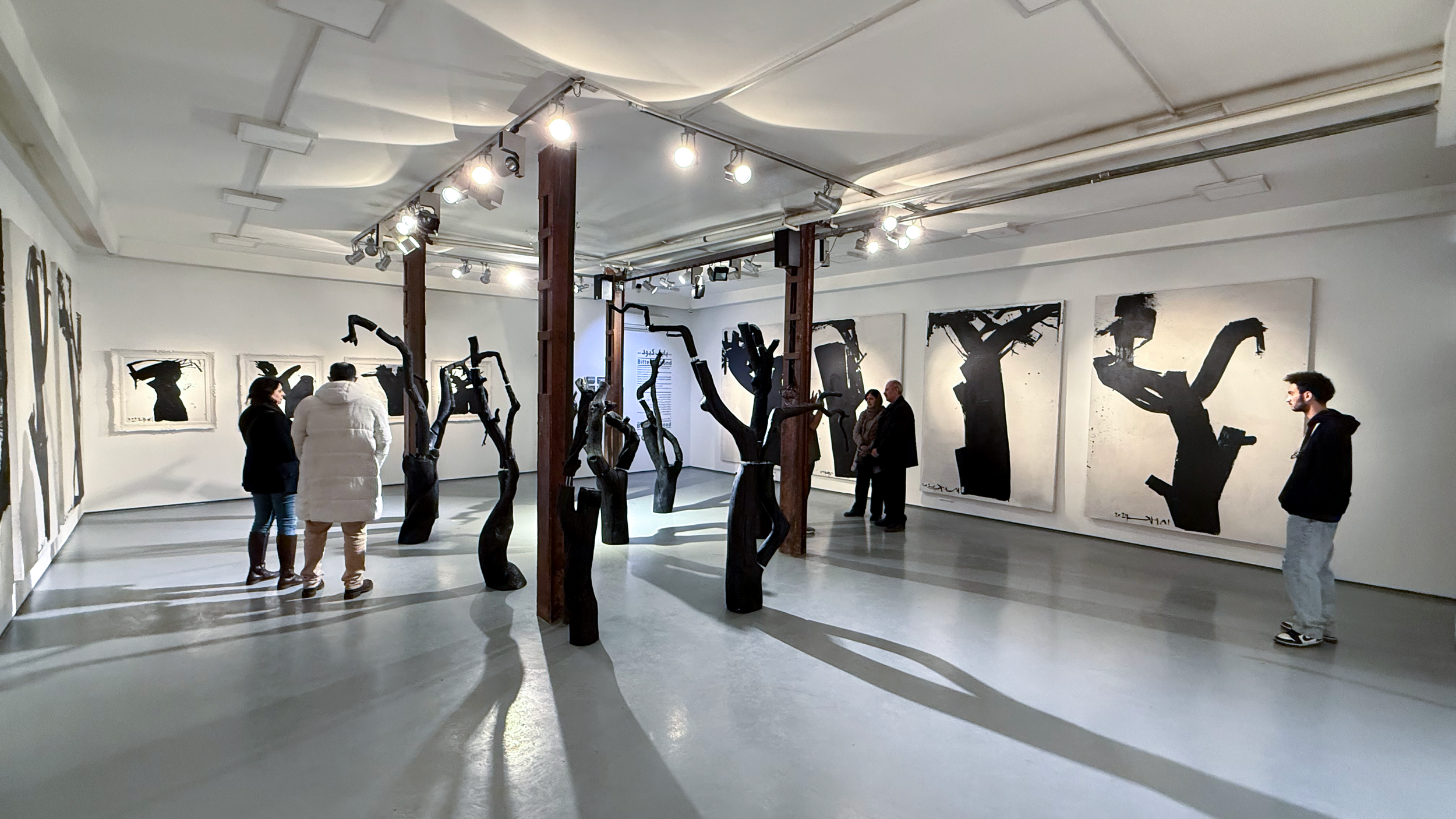 Kabood’s paintings emerge from the soil of personal and collective memory. Central to the exhibition is the parable of the bitter almond tree – a recurring motif drawn from his grandmother’s tales. This tree, thriving in drought yet trembling at loneliness, becomes a potent metaphor for resilience amidst societal neglect. Kabood’s canvases translate this narrative into visceral imagery: figures stripped of identity hover in spatial suspension; roots claw through pigment; almond blossoms bleed into abstract voids.